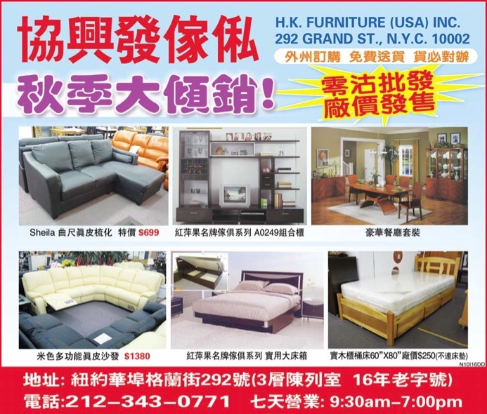 於1994年“協興發傢俬”創立於美國紐約,至今走過了15年的歷程,已成為傢俱行業中頗有實力的商戶。在紐約,幾乎每一座住宅大廈都有人在使用協興發所出售的傢俱。因為我們多年來代理現代風格設計理念的名牌傢俱“紅蘋果”該公司產品遠銷至日本,美國,英國,澳洲和東南亞等世界各地,滿足了客人對品質和生活上極高要求。本公司更為本地及外州顧客提供免費送貨,按裝及售後服務。慕求令每一位顧客都有物有所值的感覺。